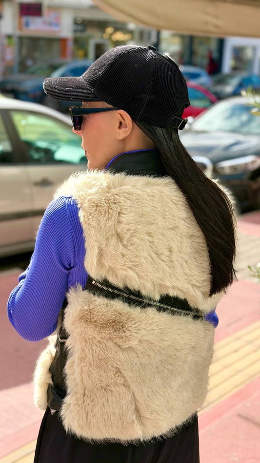 Ιδιαίτερο γιλέκο με δερμάτινη και γούνα μπεζ