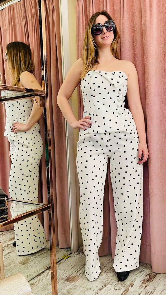 Γυναικείο Σετ Πουά με Strapless Top & Παντελόνι Ασπρο-2