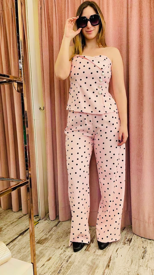 Γυναικείο Σετ Πουά με Strapless Top & Παντελόνι Ροζ-1