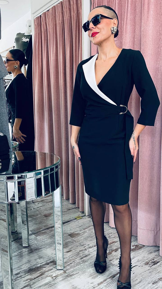 Φόρεμα μαύρο σε ίσια γραμμή με λευκό μονό γιακά και λεπτομέρεια ζωνακι
