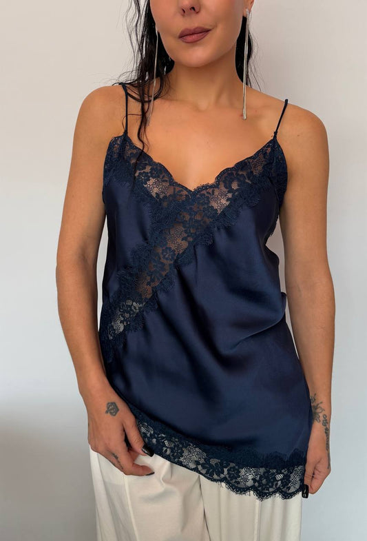Γυναικείο Satin Top με Δαντέλα Σκούρο μπλε-6