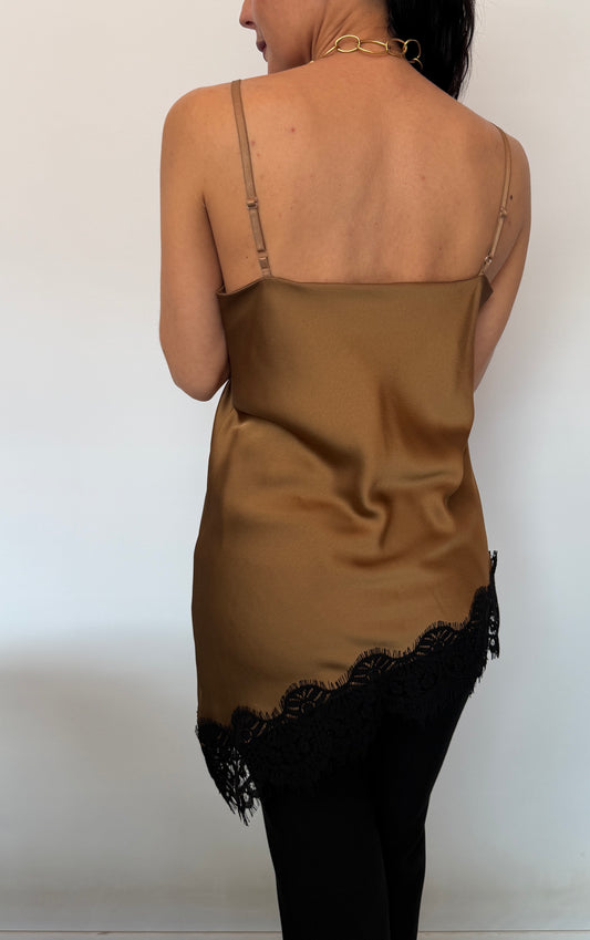 Γυναικείο Satin Top με Δαντέλα & Ασύμμετρο Τελείωμα Καφε-2