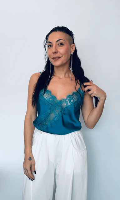 Γυναικείο Satin Top με Δαντέλα Πετρολ-5