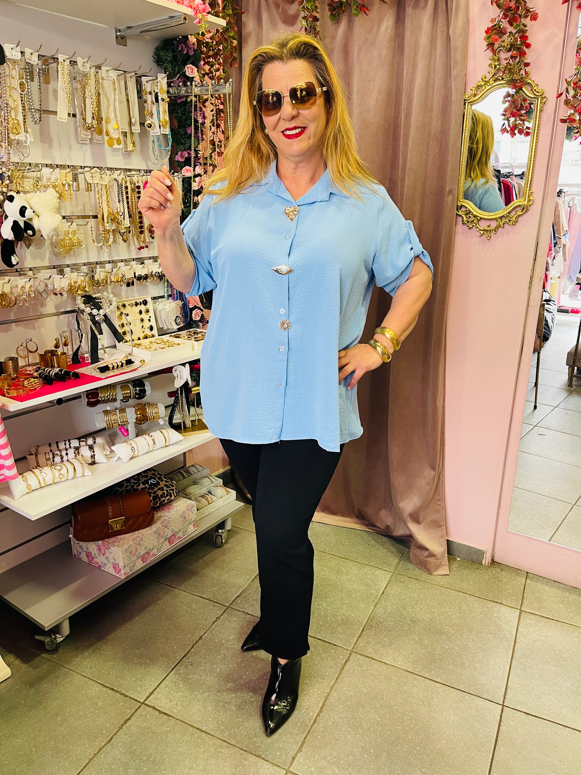 Κομψό γυναικείο πουκάμισο με ιδιαίτερες διακοσμητικές χρυσές καρφίτσες δίπλα στα κουμπιά. Ιδανικό για κομψές καθημερινές εμφανίσεις.