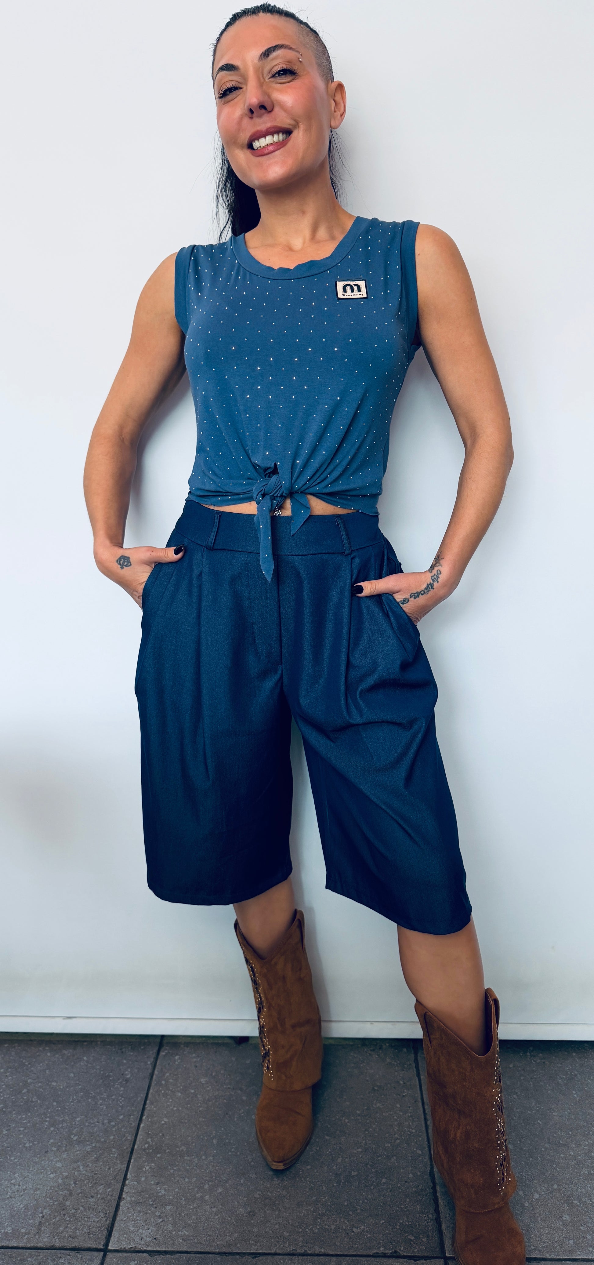 Γυναικείο Crop Top με Δέσιμο & Διακριτικά Strass μπλε-1