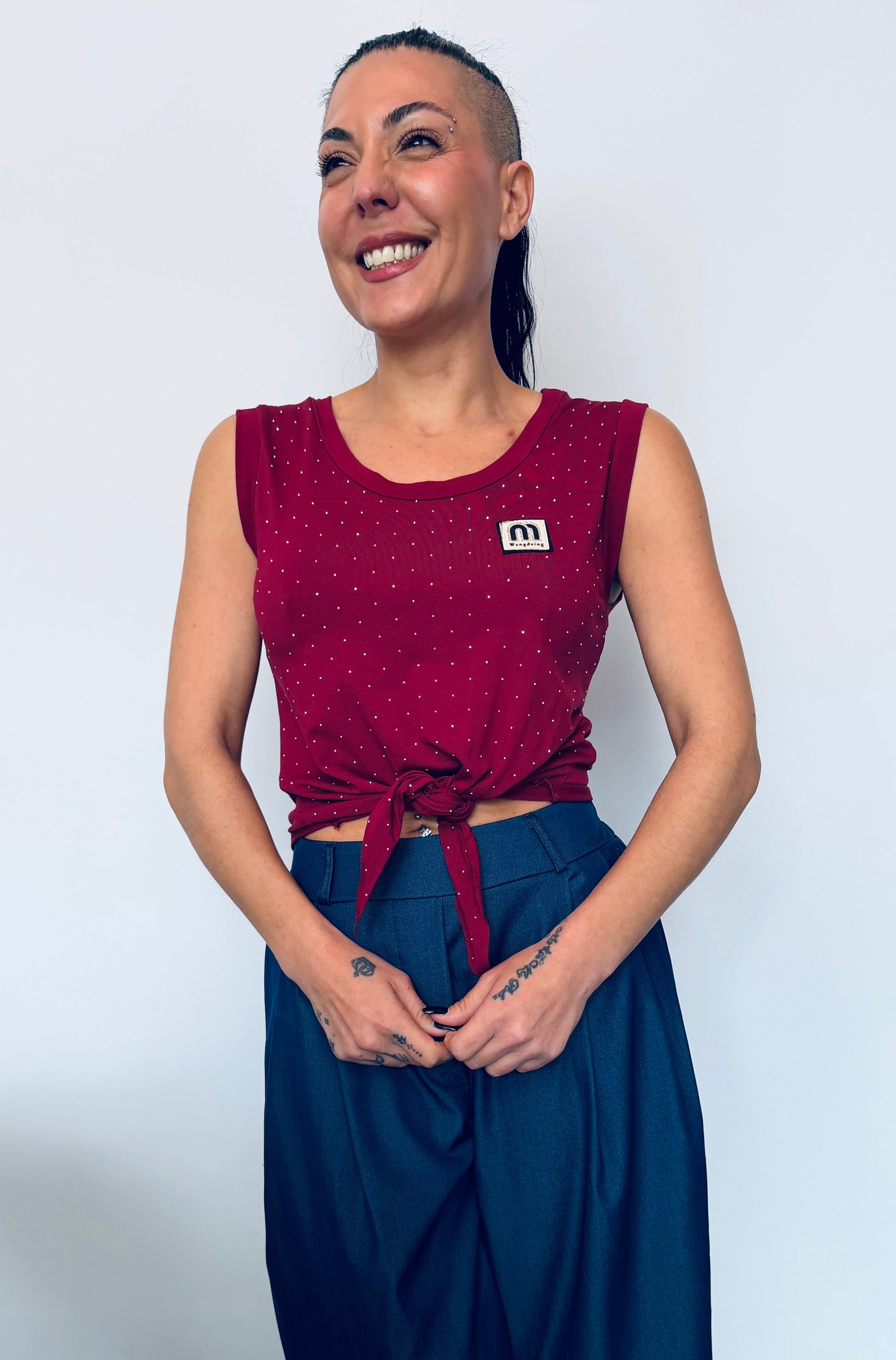 Μοντέρνο γυναικείο crop top με δέσιμο στο μπροστινό μέρος που αναδεικνύει τη σιλουέτα και προσθέτει θηλυκό χαρακτήρα. Διακοσμημένο με μικρά strass που χαρίζουν διακριτική λάμψη χωρίς υπερβολές.