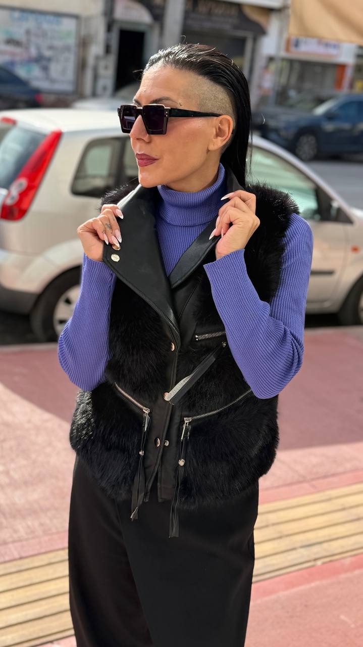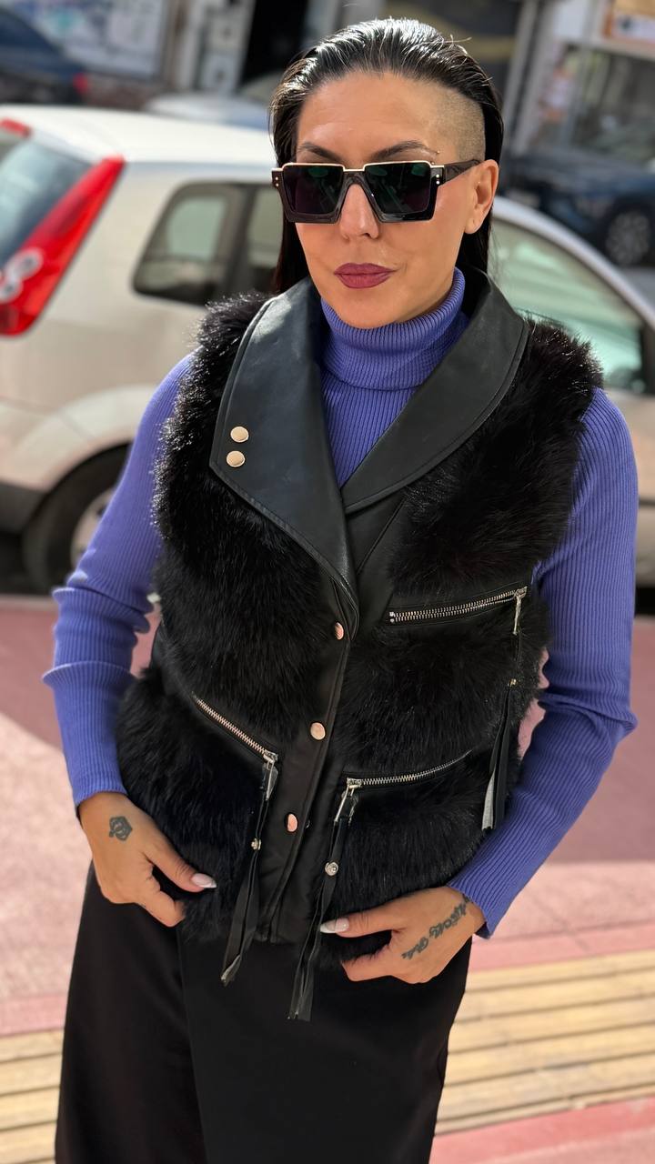 Ιδιαίτερο Γιλέκο με δερμάτινες λεπτομέρειες και μαύρη γούνα περιμετρικά και σχέδια με φερμουάρ