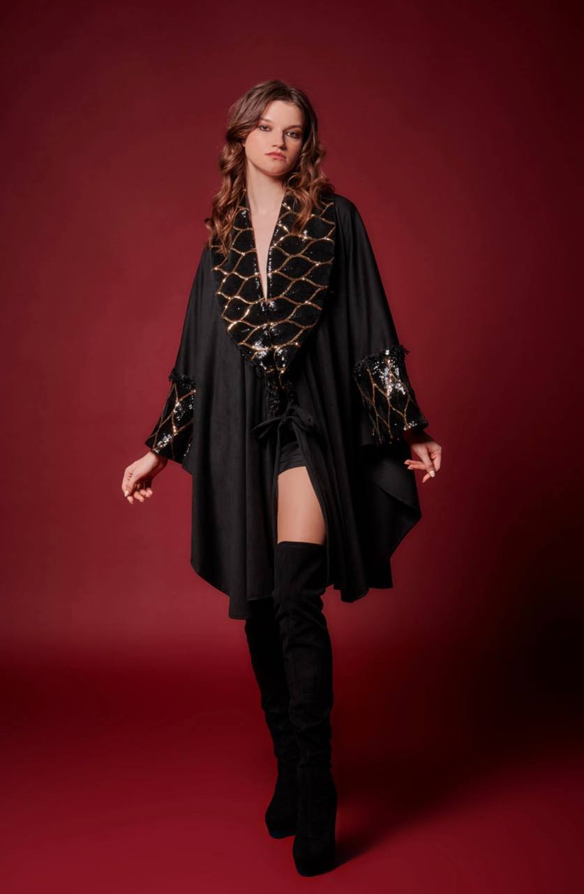 Λεπτομέρειες με μαύρες και χρυσές παγιετες στον γιακά και στα μανίκια