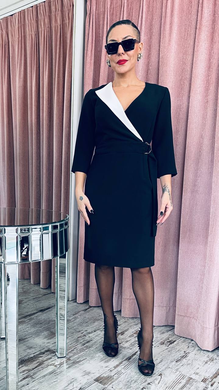 Φόρεμα μαύρο σε ίσια γραμμή με λευκό μονό γιακά και λεπτομέρεια ζωνακι