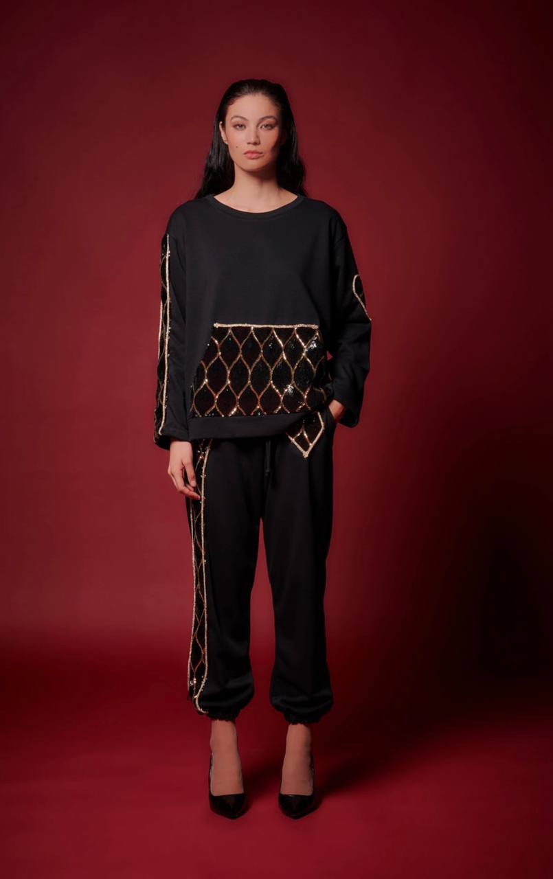 Διακοσμητικές λεπτομέρειες στα μανίκια και στην όψη της μπλούζας με χρυσές & μαύρες παγιετες