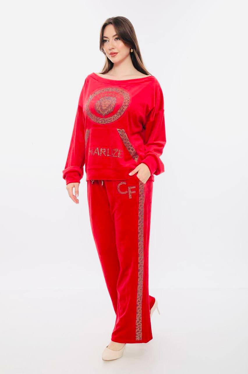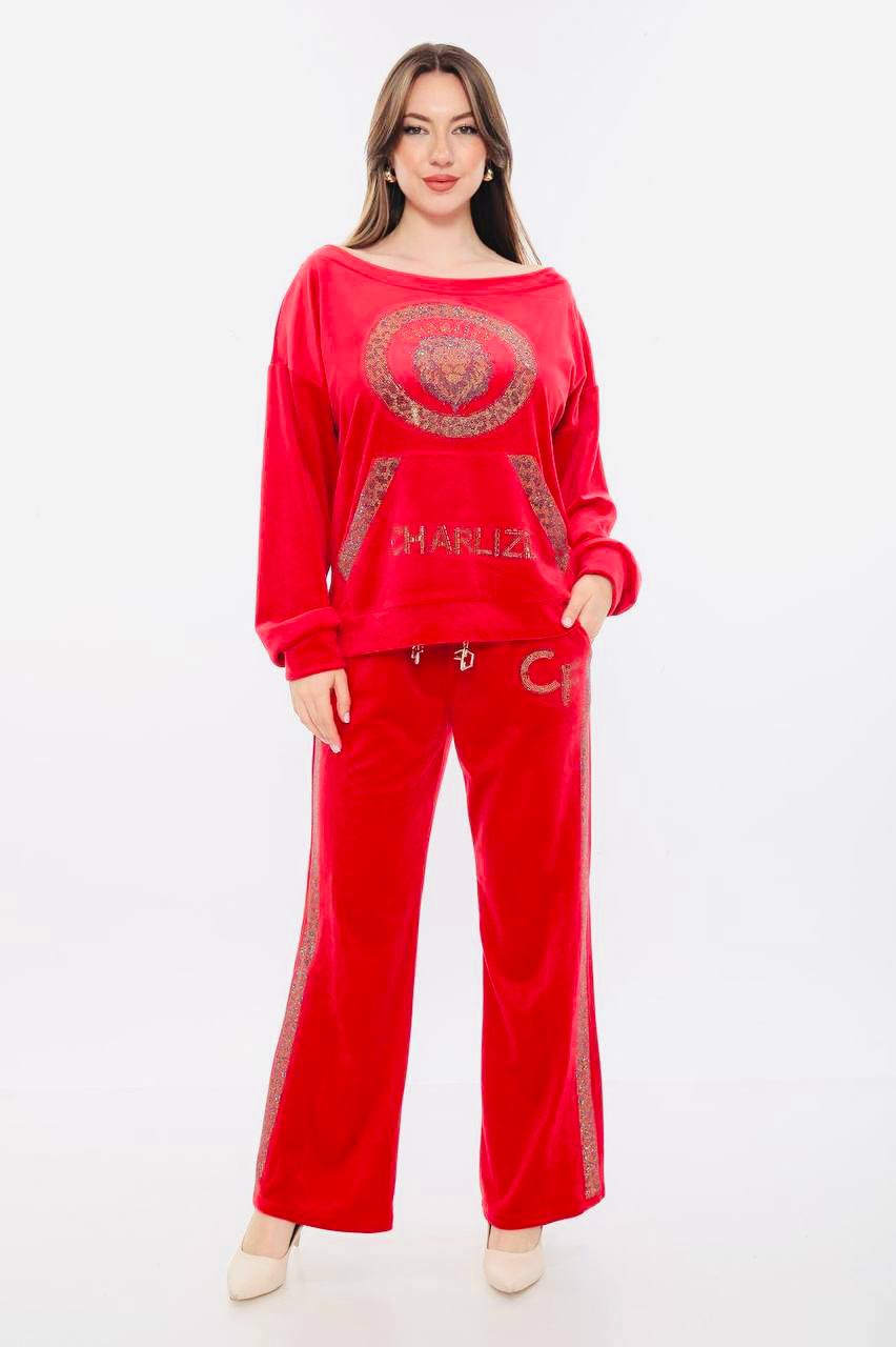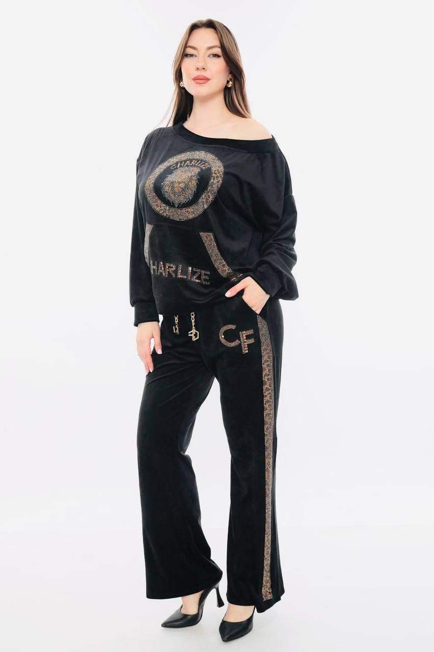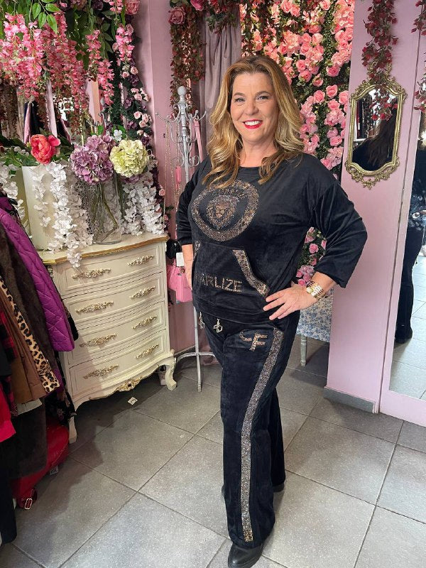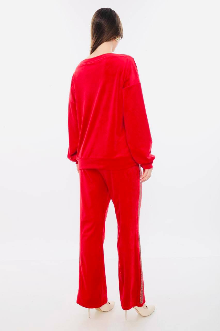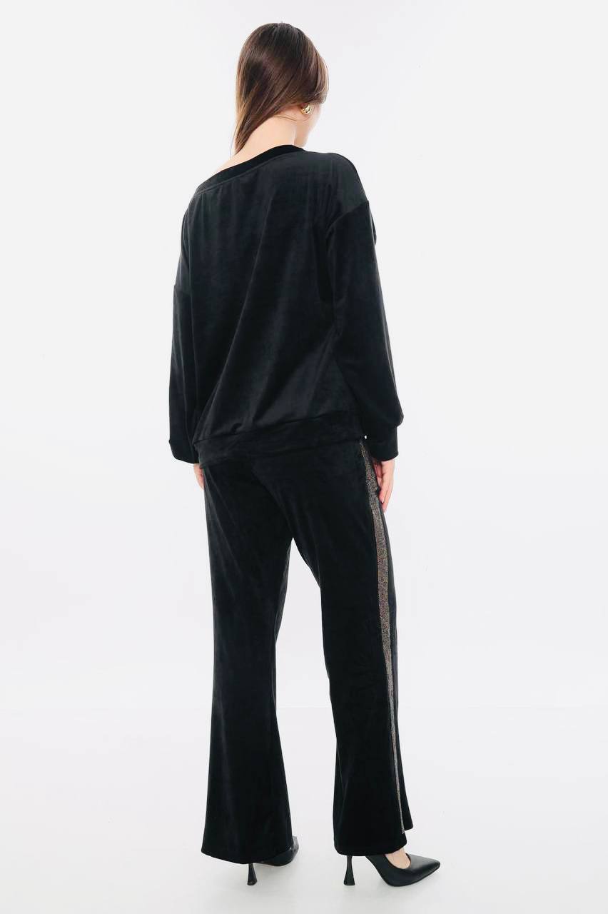 Σετ βελουτέ φόρμα μπλούζα και παντελόνι με λεπτομέρειες στρας στην μπλούζα & το παντελόνι καθώς και αλυσίδα στην μέση