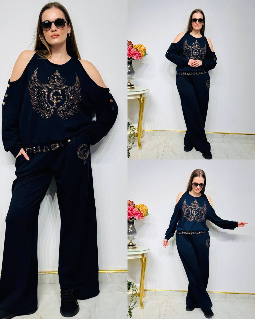 Σετ μπλούζα & παντελόνι, βαμβακερό με λεπτομέρειες στρας και ανοίγματα στους ώμους