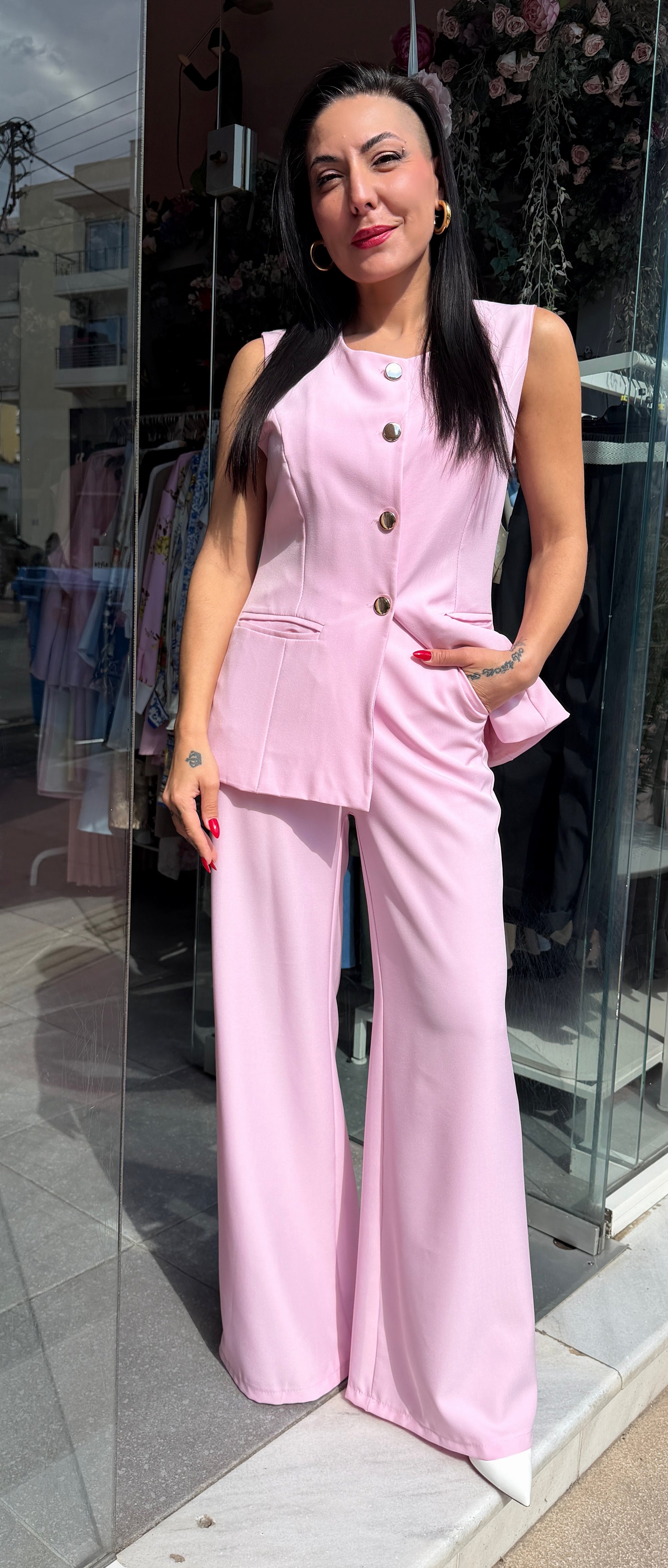 Σετ ροζ γιλέκο με κουμπια και παντελόνι-2