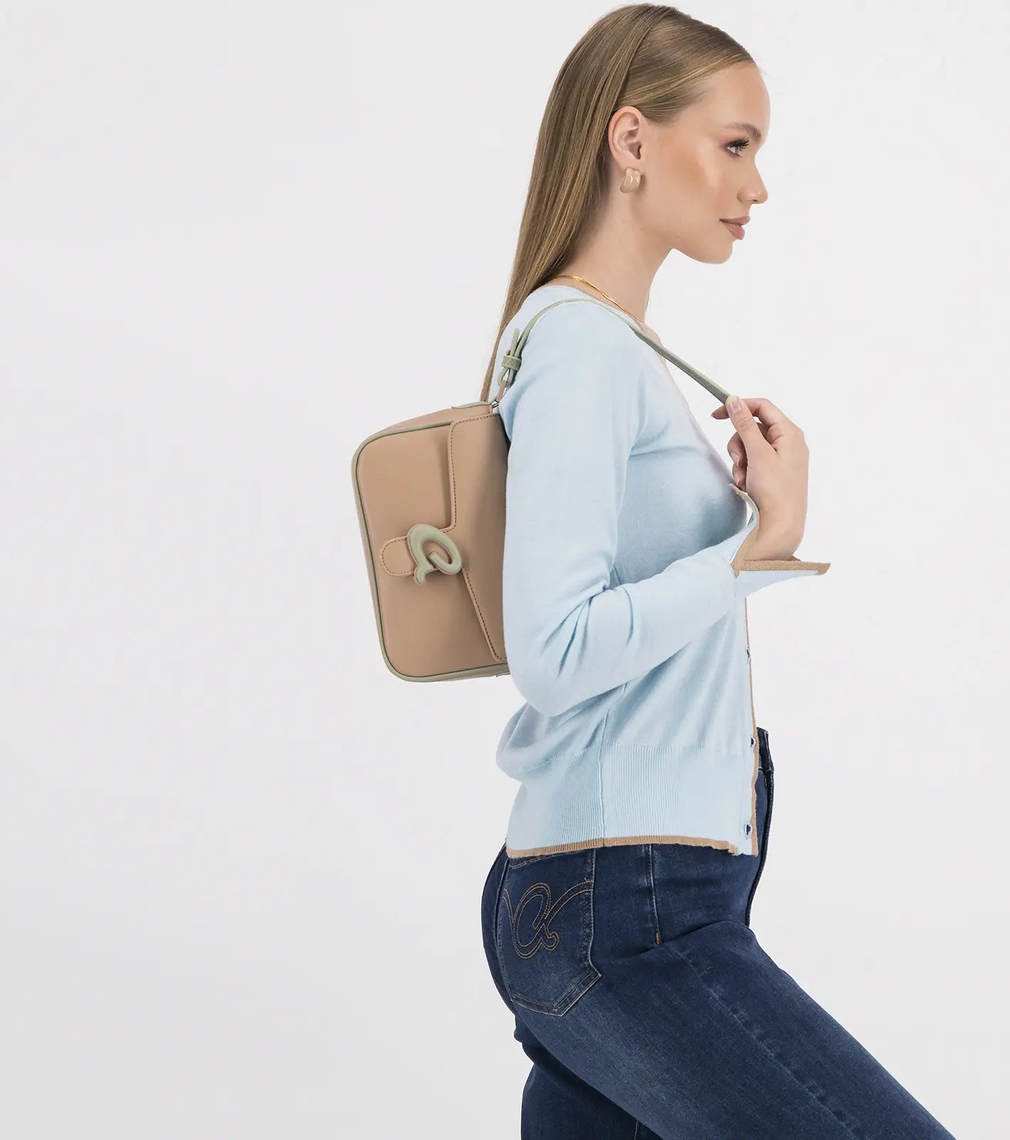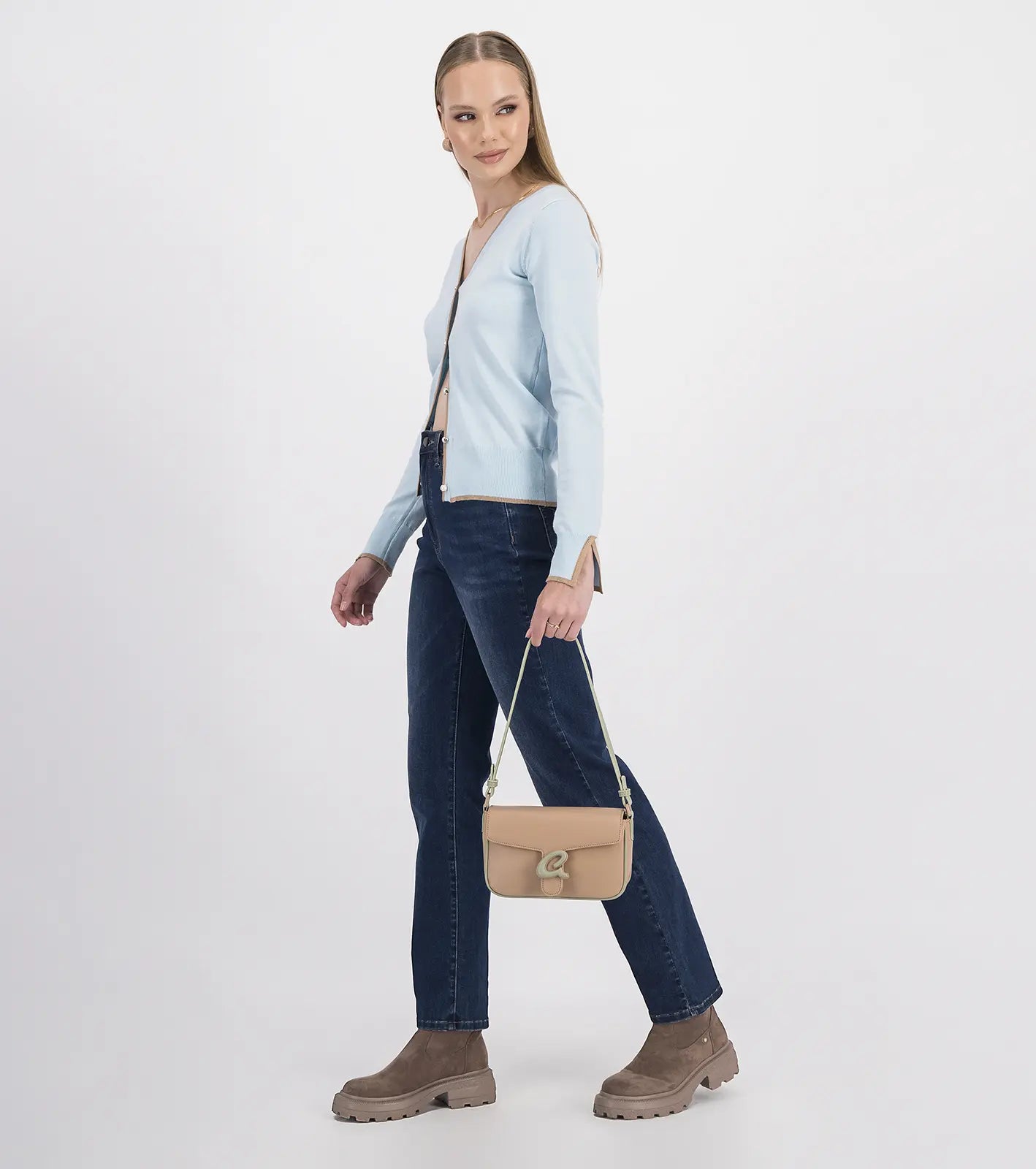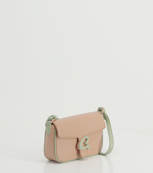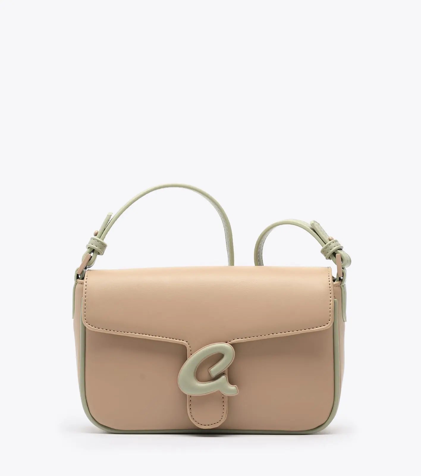 Τσάντα χιαστί μοντέρνας και εκλεπτυσμένης εμφάνισης, κατασκευασμένη από ανακυκλωμένο τεχνόδερμα. Κλείνει με καπάκι με χαρακτηριστικό κούμπωμα το λογότυπο 'a', προσφέροντας ασφάλεια και στυλ. Διαθέτει κοντό έξτρα λουράκι, επιτρέποντας τη χρήση της και ως τσάντα ώμου για μεγαλύτερη ευελιξία. Εσωτερικά, είναι πλήρως φοδραρισμένη και περιλαμβάνει μια τσέπη με φερμουάρ και μια ανοιχτή θήκη για εύκολη οργάνωση των αντικειμένων σας. Ιδανική για καθημερινή χρήση, συνδυάζει την πρακτικότητα με την κομψότητα σε κάθε σας εμφάνιση.